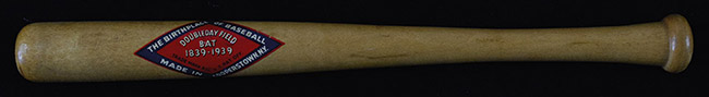 Description:Rare high grade "Doubleday Field" miniature decal bat c.1939 (EX/MT-NM) Wooden mini-bat (12" long) bearing colorful decal commemorating "The Birthplace of Baseball, Doubleday Field+" Likely relates to the Baseball Centennial of 1939 and this is the first such example we have offered. Very strong condition with a few minute flecks of loss: EX/MT-NM ($300-$500)