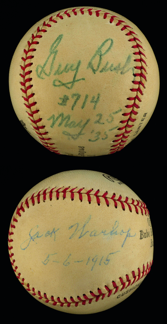 Description:Unique Jack Warhop and Guy Bush dual signed baseball - Babe Ruth's first and last homerun pitchers (EX/MT) Rawlings "Official Babe Ruth League Baseball" has been signed on a side panel "Jack Warhop" with the date "5-6-1915" inscribed below. Opposite panel is signed "Guy Bush #714 May 25 '35." Signatures rate 7 (Bush) to 8 out of 10. Ball displays an even cream coloration with the only mentionable wear being a near incidental tiny surface imperfection near the Warhop autograph: EX/MT ($1,000-$1,500)