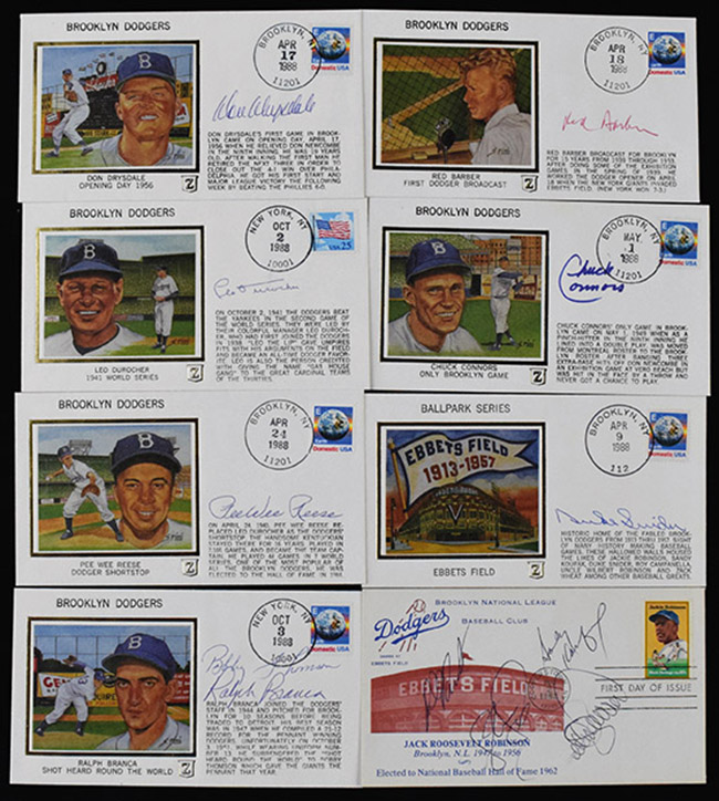 Description:Collection of (51) Brooklyn Dodgers signed commemorative postal covers (incl. HOFers and deceased) (EX/MT-NM) Nice grouping mostly comprised of Z-Silk cachets with a few other types mixed. Includes (3) multi-signed covers with Bobby Thomson and Ralph Branca and (2) additional multi-signed with (6) and (4) signatures each (Sandy Koufax appears on one of these). Single signed covers incl. Don Drysdale, Chuck Connors, Pee Wee Reese, Leo Durocher, Cal Abrams, (3) Duke Snider, Billy Herman, Carl Furillo, Tom Lasorda, Peter O'Malley, Sandy Amoros, (3) Red Barber, (2) Gene Hermanski, (2) Cookie Lavagetto, Eddie Stanky, Roger Craig, Vin Scully, Ed Miksis, Shotgun Shuba, Johnny Podres, (5) Carl Erskine, (2) Clem Labine, Mickey Owen, Eddie Stanky, (2) Preacher Roe, Andy Pafko, Clyde King, (2) Don Newcombe, Ransom Jackson, Rube Walker, Jim Hughes, John Sain, Joe Black, Dick Sisler, and Sal Maglie. There are a few additional unsigned pieces. Ink and marker signatures rate 7/8 to 9/10 out of 10: EX/MT-NM ($400-$600)