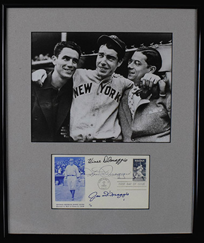 Description:Joe, Dom, and Vince DiMaggio signed Babe Ruth First Day Issue postal cover (NM) Vintage cover (postmarked 1983) has been signed by the DiMaggio brothers in ink and marker rating 8 to 9/10 out of 10. Framed for display to 12.75"x15" overall (hint of wear to frame): NM ($300-$500)