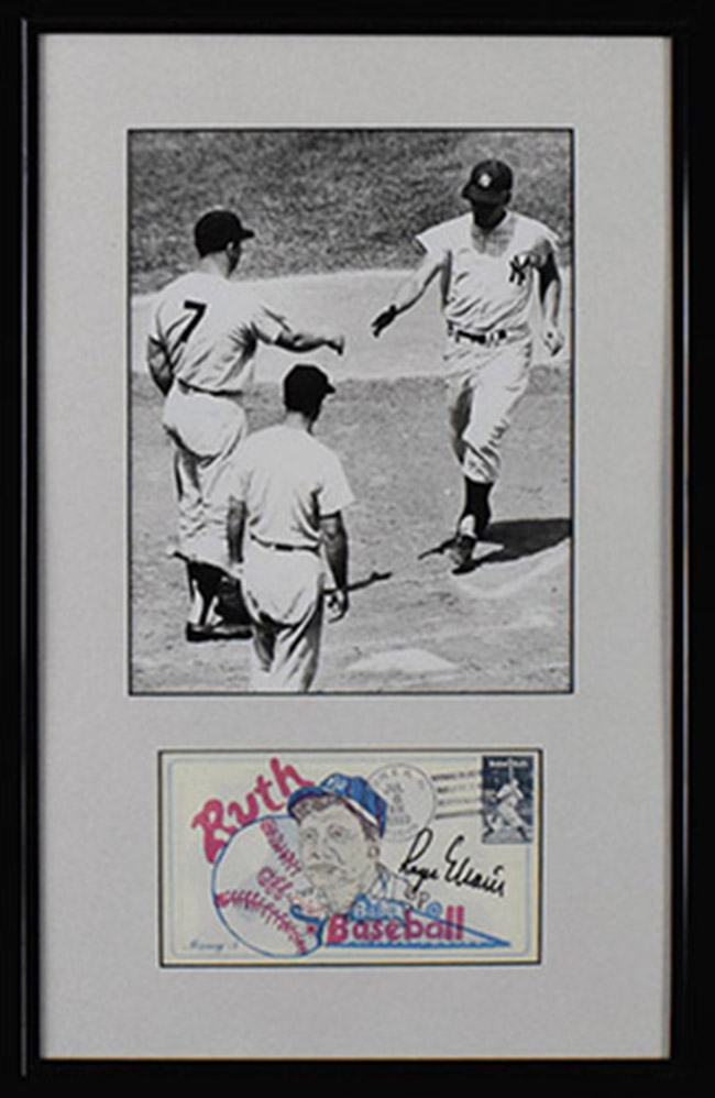 Description:Roger Maris signed Babe Ruth commemorative postal cover (postmarked 1983) (EX/MT-NM) Bold black marker signature rating 8/9 out of 10 appears on cover which was cancelled in 1983 for the Ruth stamp first day of issue. Framed to 11"x17.5" for display (hint of wear to frame): EX/MT-NM ($300-$500)