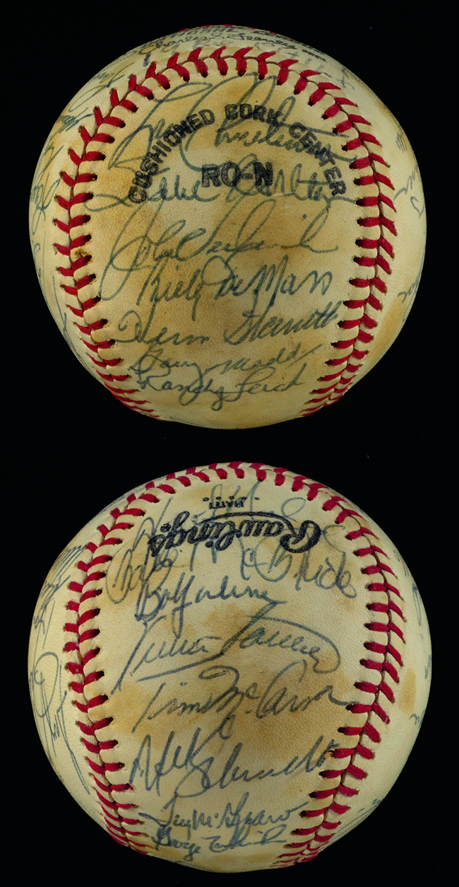 Description:1980 Philadelphia Phillies team signed baseball (World Series Champions) - (28) signatures (Sigs. EX/MT-NM, Ball EX-EX/MT) Rawilngs C.Feeney Official National League baseball has been signed by (27) incl. McGraw, Schmidt, Carlton, Rose, Green, Luzinski (twice), Boone, Bowa, Trillo, McBride, McCarver, and others. Ink signatures rate 7/8-8 out of 10, ball displays light/mild scattered areas of toning. The overlap of Greg Luzinski and Coach Mike Ryan only occurred during the 1980 season and a year identifier has been written on near stampings: Sigs. EX/MT-NM, Ball EX-EX/MT ($500-$750)