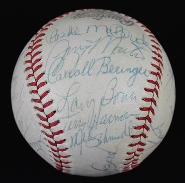 Description:1977 Philadelphia Phillies team signed baseball (NM). C.Feeney NL ball signed by (25) members of the 1977 National League East champion Phillies including Danny Ozark, Billy DeMars, Ray Rippelmeyer, Bobby Wine, Mike Schmidt, Steve Carlton, Tug McGraw, Bob Boone, Richie Hebner, Ted Sizemore, Larry Bowa, Greg Luzinski, Garry Maddox, Jay Johnstone, Bake McBride, Larry Christenson, Tim McCarver, Randy Lerch, Jim Kaat, Gene Garber, and others. Signatures rate 6/7 to 10 (avg 8/9) out of 10: NM