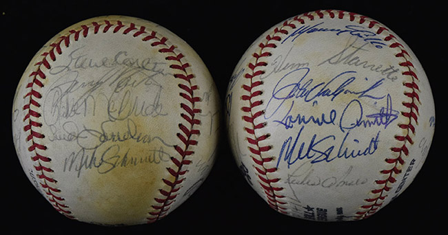 Description:1978 and 1981 Philadelphia Phillies team signed baseballs (EX-EX/MT). Incl. C.Feeney NL ball signed by (20) members of the 1978 Phillies: Mike Schmidt, Steve Carlton, Tug McGraw, Bob Boone, Greg Luzinski, Bake McBride, Ted Sizemore, Larry Christenson, Jerry Martin, Randy Lerch, Jim Kaat, Jim Lonborg, Ron Reed, and others; and C.Feeney NL ball signed by (21) members of the 1981 Phillies: Dallas Green, Mike Schmidt, Steve Carlton, Pete Rose, Tug McGraw, Bob Boone, Manny Trillo, Larry Bowa, Nino Espinosa, Lonnie Smith, Marty Bystrom, Sparky Lyle, and others. Signatures rate 6 to 10 (avg 8) out of 10. Both have areas of light to moderate toning: EX-EX/MT