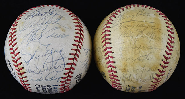 Description:1978 Philadelphia Phillies and 1979 Los Angeles Dodgers team signed baseballs (EX-EX/MT). Incl. C.Feeney NL ball signed by (23) members of the 1978 Phillies: Danny Ozark, Mike Schmidt, Tug McGraw, Bob Boone, Richie Hebner, Ted Sizemore, Larry Bowa, Greg Luzinski, Bake McBride, Randy Lerch, Jerry Martin, Jose Cardenal, Tim McCarver, Ron Reed, and others (EX, toned, sigs average 7 out of 10); and C.Feeney NL ball signed by (24) members of the 1979 Dodgers: Tom Lasorda, Red Adams, Don Sutton, Steve Garvey, Rick Sutcliffe, Steve Yeager, Ron Cey, Dusty Baker, Reggie Smith, Charlie Hough, and others (EX/MT, sigs average 8 out of 10): EX-EX/MT