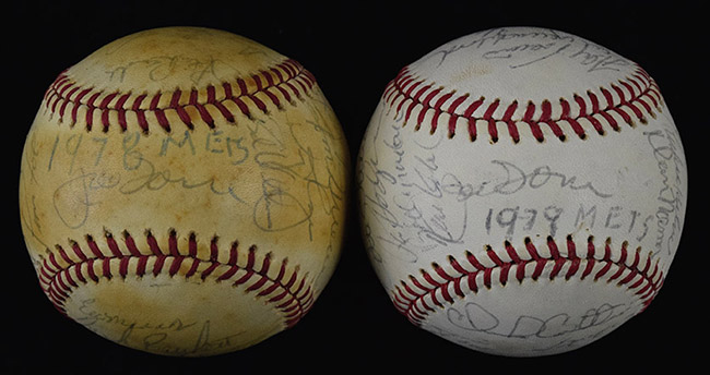 Description:1978 and 1979 New York Mets team signed baseballs (EX-NM). Incl. C.Feeney NL ball signed by (24) members of the 1978 Mets: Joe Torre, Phil Cavarretta, Doug Flynn, Tim Foli, Len Randle, Steve Henderson, Elliott Maddox, Nino Espinosa, Dale Murray, and others (EX, toned, sigs average 6/7 out of 10); and C.Feeney NL ball signed by (26) members of the 1979 Mets: Joe Torre, Dick Sisler, John Stearns, Doug Flynn, Richie Hebner, Lee Mazzilli, Joel Youngblood, Craig Swan, Kevin Kobel, Dale Murray, and others (NM, sigs average 8 out of 10): EX-NM
