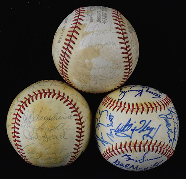 Description:1978, 1979, and 1980 St. Louis Cardinals team signed baseballs (VG/EX-EX/MT). Incl. C.Feeney NL ball signed by (23) members of the 1978 Cardinals: Vern Rapp, Jack Krol, Lou Brock, Ted Simmons, Keith Hernandez, Garry Templeton, Mike Tyson, Ken Reitz, Jerry Morales, Bob Forsch, Pete Vuckovich, Mark Littell, and others (VG/EX, moisture stain, sigs average 6/7 out of 10); C.Feeney NL ball signed by (23) members of the 1979 Cardinals: Ken Boyer, Red Schoendienst, Keith Hernandez, Ken Oberkfell, Garry Templeton, Ken Reitz, Tony Scott, Pete Vuckovich, Bob Forsch, John Denny, John Fulgham, Mark Littell, and others (EX, toned, sigs average 7 out of 10); and C.Feeney NL ball signed by (26) members of the 1980 Cardinals: Whitey Herzog, Jack Krol, Ted Simmons, Keith Hernandez, Bobby Bonds, Ken Oberkfell, Ken Reitz, Tony Scott, Bob Sykes, Silvio Martinez, John Littlefield, Jim Kaat, and others, with Vuckovich being clubhouse signed (EX/MT, sigs average 8/9 out of 10). Range: VG/EX-EX/MT