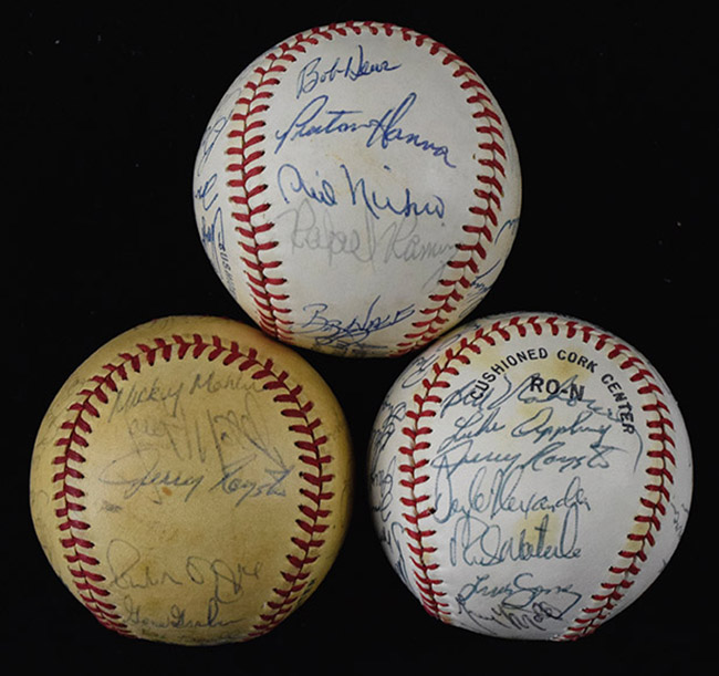 Description:1979, 1980, and 1981 Atlanta Braves team signed baseballs (VG/EX-NM). Incl. C.Feeney NL ball signed by (22) members of the 1979 Braves: Tommie Aaron, Dale Murphy, Bob Horner, Jeff Burroughs, Bruce Benedict, Glenn Hubbard, Rowland Office, Gary Matthews, Mickey Mahler, Gene Garber, Joey McLaughlin, and others, with Cox being clubhouse signed (VG/EX, surface wear/toning, sigs average 7 out of 10); C.Feeney NL ball signed by (26) members of the 1980 Braves: Bob Cox, Luke Appling, Tommie Aaron, Dale Murphy, Jeff Burroughs, Chris Chambliss, Glenn Hubbard, Luis Gomez, Gary Matthews, Doyle Alexander, Tom Boggs, Rick Matula, Rick Camp, Gene Garber, and others (EX-EX/MT, sigs average 8/9 out of 10); and C.Feeney NL ball signed by (21) members of the 1981 Braves: Bobby Cox, Luke Appling, Tommie Aaron, Phil Niekro, Bob Horner, Rafael Ramirez, Rufino Linares, Tom Boggs, Bob Walk, Rick Mahler, and others, with Murphy being clubhouse signed (EX/MT-NM, sigs average 8/9 out of 10): VG/EX-NM