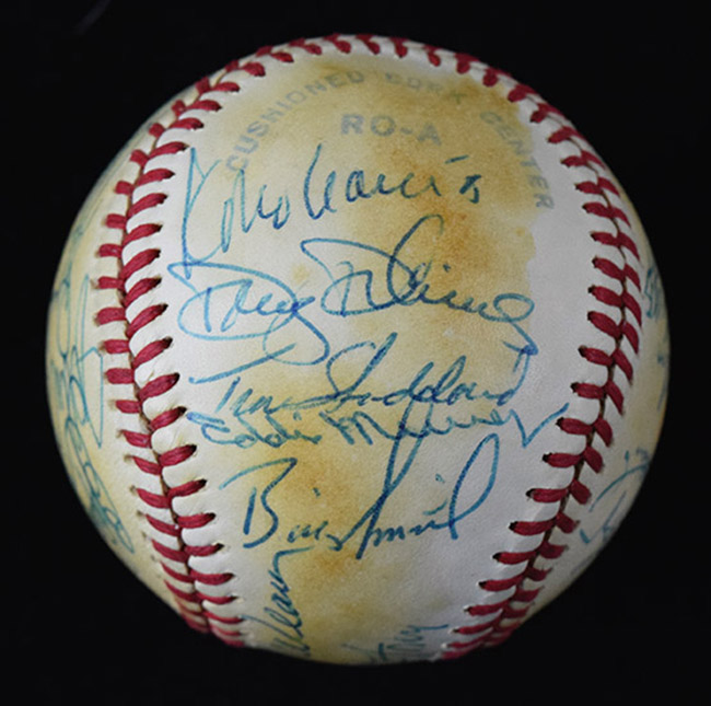 Description:1979 Baltimore Orioles team signed baseball (EX). L.MacPhail AL ball signed by (26) members of the 1979 American League champion Orioles including Earl Weaver, Eddie Murray, Mike Flanagan, Rick Dempsey, Rich Dauer, Kiko Garcia, Doug DeCinces, Gary Roenicke, Al Bumbry, Ken Singleton, Lee May, Mark Belanger, Steve Stone, Scott McGregor, Don Stanhouse, Sammy Stewart, Tippy Martinez, and others. Signatures rate 6 to 9/10 (avg 7/8) out of 10. Moderate toning on all panels: EX