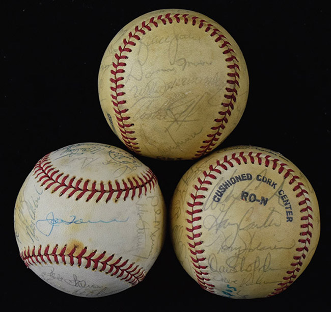 Description:1979 Chicago Cubs, Montreal Expos, and New York Mets team signed baseballs (VG/EX-EX/MT). Incl. C.Feeney NL ball signed by (23) members of the 1979 Cubs: Herman Franks, Bruce Sutter, Dave Kingman, Bobby Murcer, Ted Sizemore, Ivan DeJesus, Steve Ontiveros, Jerry Martin, Scot Thompson, Rick Reuschel, Larry Biittner, Lynn McGlothen, Mike Krukow, Dick Tidrow, Willie Hernandez, Donnie Moore, and others (VG/EX, heavy toning, sigs average 6/7 out of 10); C.Feeney NL ball signed by (23) members of the 1979 Expos: Dick Williams, Gary Carter, Tony Perez, Chris Speier, Larry Parrish, Warren Cromartie, Ellis Valentine, Steve Rogers, Bill Lee, Elias Sosa, Dave Palmer, and others, with Dawson being clubhouse signed (EX, toned, sigs average 7/8 out of 10); and C.Feeney NL ball signed by (27) members of the 1979 Mets: Joe Torre, Dick Sisler, John Stearns, Guillermo (Willie) Montanez, Doug Flynn, Steve Henderson, Joel Youngblood, Craig Swan, Pete Falcone, Neil Allen, and others (EX-EX/MT, toning, sigs average 8 out of 10): VG/EX-EX/MT