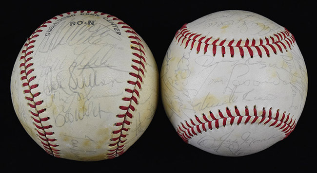 Description:1979 and 1982 Los Angeles Dodgers team signed baseballs (EX-EX/MT). Incl. C.Feeney NL ball signed by (24) members of the 1979 Dodgers: Tom Lasorda, Don Sutton, Steve Garvey, Steve Yeager, Ron Cey, Dusty Baker, Reggie Smith, Rick Sutcliffe, Charlie Hough, and others (EX, toning); C.Feeney NL ball signed by (28) members of the 1982 Dodgers: Tommy Lasorda, Mike Scioscia, Steve Garvey, Fernando Valenzuela, Pedro Guerrero, Bill Russell, Ron Cey, Dusty Baker, Ken Landreaux, Jerry Reuss, Bob Welch, Burt Hooton, Steve Howe, Dave Stewart, and others (EX/MT, toning). Signatures rate 5/6 to 8/9 (avg 7/8) out of 10: EX-EX/MT