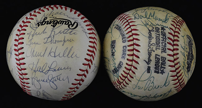Description:1979 and 1981 St. Louis Cardinals team signed baseballs (EX-EX/MT). Incl. C.Feeney NL ball signed by (26) members of the 1979 Cardinals: Ken Boyer, Lou Brock, Keith Hernandez, Ted Simmons, Ken Oberkfell, Garry Templeton, Ken Reitz, Tony Scott, George Hendrick, Pete Vuckovich, Johnny Denny, Mark Littell, and others; and C.Feeney NL ball signed by (24) members of the 1981 Cardinals: Whitey Herzog, Red Schoendienst, Bruce Sutter, Darrell Porter, Garry Templeton, Ken Oberkfell, George Hendrick, Bob Forsch, Silvio Martinez, Joaquin Andujar, Jim Kaat, and otheres. Signatures rate 6/7 to 9/10 (avg 8) out of 10. Both have light to moderate toning: EX-EX/MT