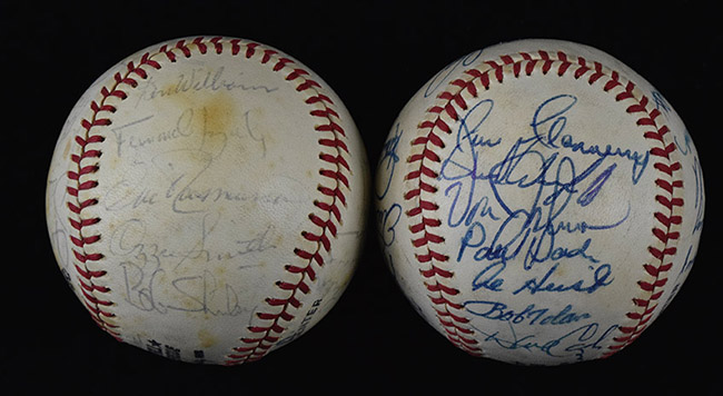Description:1979 and 1980 San Diego Padres team signed baseballs (EX-EX/MT). Incl. C.Feeney NL ball signed by (22) members of the 1979 Padres: Roger Craig, Whitey Wietelmann, Dave Winfield, Ozzie Smith, Gaylord Perry, Rollie Fingers, Gene Tenace, Dan Briggs, Fernando Gonzalez, Jerry Turner, Randy Jones, Kurt Bevacqua, Bob Shirley, Eric Rasmussen, and others (sigs average 7 out of 10); and C.Feeney NL ball signed by (21) members of the 1980 Padres: Jerry Coleman, Dave Winfield, Ozzie Smith, Gene Tenace, Dave Cash, Aurelio Rodriguez, Steve Mura, Randy Jones, Rick Wise, and others (sigs average 8/9 out of 10). Both have areas of light to moderate toning and/or surface wear: EX-EX/MT