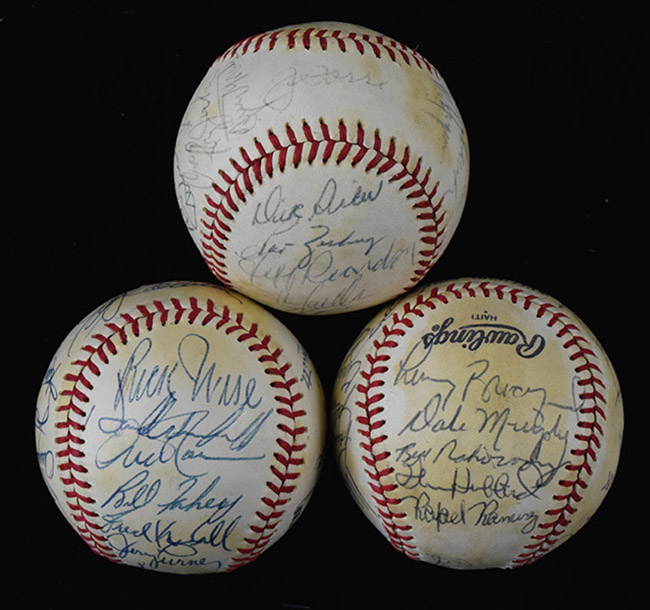 Description:1980 Atlanta Braves, New York Mets, and San Diego Padres team signed baseballs (EX-EX/MT). Incl. C.Feeney NL ball signed by (26) members of the 1980 Braves: Bob Cox, Luke Appling, Tommie Aaron, Dale Murphy, Chris Chambliss, Jeff Burroughs, Glenn Hubbard, Luis Gomez, Gary Matthews, Doyle Alexander, Tom Boggs, Rick Matula, Rick Camp, Gene Garber, and others; C.Feeney NL ball signed by (28) members of the 1980 Mets: Joe Torre, Dick Sisler, Lee Mazzilli, Doug Flynn, Elliott Maddox, Jerry Morales, Pat Zachry, Mark Bomback, Pete Falcone, Craig Swan, Neil Allen, and others; C.Feeney NL ball signed by (21) members of the 1980 Padres: Jerry Coleman, Dave Winfield, Ozzie Smith, Gene Tenace, Dave Cash, Aurelio Rodriguez, Steve Mura, Randy Jones, Rick Wise, Gary Lucas, and others. Signatures rate 5/6 to 9/10 (avg 8) out of 10. All have areas of light to moderate toning: EX-EX/MT