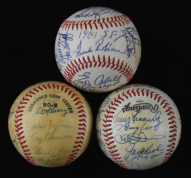 Description:1981 Montreal Expos, San Diego Padres, and San Francisco Giants team signed baseballs (EX-EX/MT). Incl. C.Feeney NL ball signed by (27) members of the 1981 Expos: Jim Fanning, Gary Carter, Andre Dawson, Steve Rogers, Chris Speier, Rodney Scott, Larry Parrish, Bill Gullickson, Scott Sanderson, Ray Burris, Woodie Fryman, Bill Lee, and others (EX, toned, sigs average 7 out of 10); C.Feeney NL ball signed by (23) members of the 1981 Padres: Frank Howard, Ozzie Smith, Terry Kennedy, Gene Richards, Ruppert Jones, Steve Mura, Chris Welsh, Gary Lucas, and others (EX/MT, toning, sigs average 8/9 out of 10); and C.Feeney NL ball signed by (27) members of the 1981 Giants: Frank Robinson, Joe Morgan, Vida Blue, Darrell Evans, Jack Clark, Doyle Alexander, Milt May, Enos Cabell, Jerry Martin, Tom Griffin, Ed Whitson, Al Holland, and others (EX/MT, toning, sigs average 8/9 out of 10): EX-EX/MT
