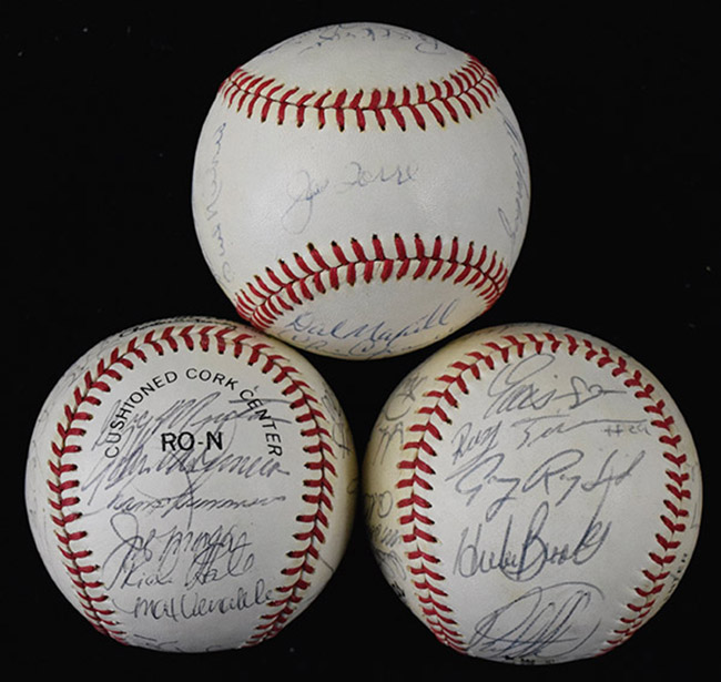 Description:1982 Atlanta Braves, New York Mets, and San Francisco Giants team signed baseballs (EX-NM). Incl. C.Feeney NL ball signed by (19) members of the 1982 Braves: Joe Torre, Bob Gibson, Phil Niekro, Dale Murphy, Chris Chambliss, Rafael Ramirez, Bob Walk, Gene Garber, and others (EX/MT, minor toning); C.Feeney NL ball signed by (24) members of the 1982 Mets: George Bamberger, Rusty Staub, John Stearns, Wally Backman, Ron Gardenhire, Hubie Brooks, George Foster, Mookie Wilson, Ellis Valentine, Pete Falcone, Craig Swan, Randy Jones, and others (EX, toning); and C.Feeney NL ball signed by (22) members of the 1982 Giants: Jim Davenport, Joe Morgan, Reggie Smith, Jeff Leonard, Chili Davis, Jack Clark, Rich Gale, Greg Minton, and others, with Robinson being clubhouse signed (EX/MT-NM). Signatures rate 6 to 9/10 (avg 8) out of 10: EX-NM