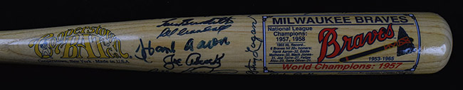 Description:1957 Milwaukee Braves team signed Cooperstown Bat Co. commemorative bat (EX/MT-NM) "Vintage Club Series" commemorative bat with team logo and related text/tiling printed at barrel end has been signed throughout. Total of (27) incl. Hank Aaron, Eddie Mathews, Joe Adcock, Warren Spahn, Red Schoendienst, Lew Burdette, Del Crandall, Gene Conley, Frank Torre, Andy Pafko, Chuck Tanner, Bobby Thomson, Bob Buhl, Bill Bruton, and others. Marker signatures generally rate 8 out of 10 with a few being slightly lesser: EX/MT-NM ($400-$600)
