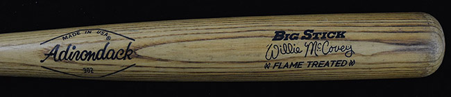 Description:Willie McCovey professional model baseball bat, c.1971-79 (EX/MT-NM, unused). 35" Adirondack 155A Willie McCovey model bat with model number stamped on the knob and McCovey's facsimile signature on the barrel. Appears unused, with minor surface wear: EX/MT-NM