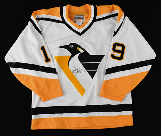 Description:Bryan Trottier signed Pittsburgh Penguins jersey (NM). CCM size 48 Penguins #19 Bryan Trottier jersey with fight strap inside. Trottier signed the jersey in black marker. Signature rates 8 out of 10: NM