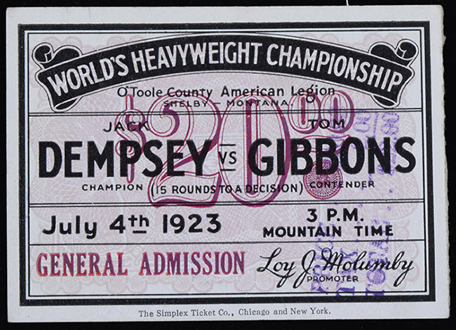 Description:1923 Jack Dempsey vs. Tom Gibbons ticket stub (EX/MT). July 4th 1923 ticket stub from Heavyweight Championship between Dempsey and Gibbons in Shelby, Montana. Dempsey retained the title with a 15-round unanimous decision. Displays only minor age/handling wear, mainly at the corners/edges: EX/MT