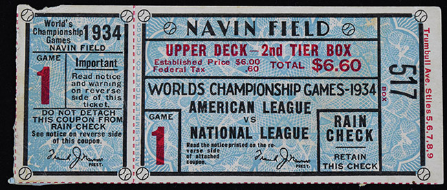 Description:1934 World Series Game 1 ticket stub, Dizzy Dean CG win (VG/EX-EX). Original ticket stub from Game 1 of the 1934 World Series played at Navin Field in which the St. Louis Cardinals defeated the Detroit Tigers by a score of 8-3 behind a complete game from Dizzy Dean. Hank Greenberg and Joe Medwick homered in the game. The majority of the ticket shows only minor wear, but the rain check portion has a chip at the top edge and area of paper loss on back edge where it was worn from the other portion of the ticket: VG/EX-EX