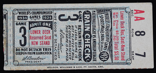 Description:1934 World Series Game 3 ticket stub (EX-EX/MT). Original ticket stub from Game 3 of the 1934 World Series played at Sportsman's Park in which the St. Louis Cardinals defeated the Detroit Tigers by a score of 4-1. Mostly minor age/handling wear, mainly at the corners/edges: EX-EX/MT