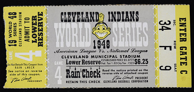 Description:1948 World Series Game 4 ticket stub, Doby HR (EX). Original ticket stub from Game 4 of the 1948 World Series played at Municipal Stadium in which the Cleveland Indians defeated the Boston Braves by a score of 2-1, with Larry Doby homering for the Indians. The majority of the ticket shows only minor wear, but rain check portion has some creasing visible: EX