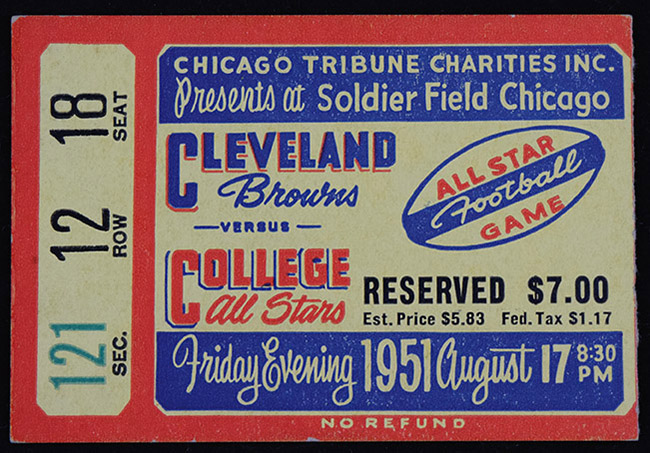 Description:1951 Cleveland Browns vs. College All Stars ticket stub (EX/MT-NM). August 17th 1951 ticket stub from game played at Soldier Field in which the Browns defeated the College All Stars by a score of 33-0. Displays only minor corner wear: EX/MT-NM