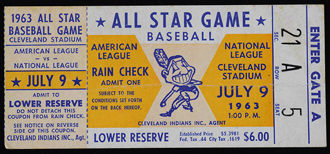 Description:1963 MLB All Star Game ticket stub, Mays MVP (VG-VG/EX). July 9th 1963 All Star Game ticket stub from game played at Cleveland Stadium in which the National League defeated the American League by a score of 5-3. Willie Mays was named MVP. Mostly minor corner/edge wear, but a long crease is visible along the center of the ticket: VG-VG/EX