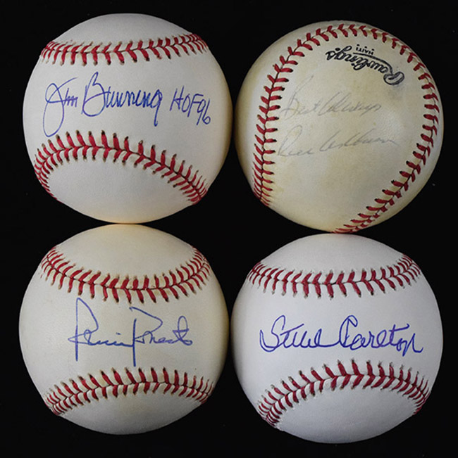 Description:Richie Ashburn, Robin Roberts, Mike Schmidt, Jim Bunning, Steve Carlton single-signed baseballs (EX-NM/MT). Incl. W.White NL ball (light toning) signed by Robin Roberts; C.Feeney NL ball (toning) signed by Richie Ashburn with "Best Wishes" inscription; L.Coleman NL ball (light toning) signed by Mike Schmidt with "10 GG" inscription (PSA/DNA); L.Coleman NL ball signed by Jim Bunning with "HOF 96" inscription; and B.Selig ML ball signed by Steve Carlton. Signatures rate 8 (Ashburn) to 10 (avg 8/9) out of 10: EX-NM/MT