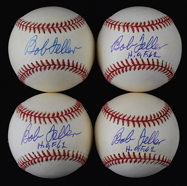 Description:Lot of (7) Bob Feller signed baseballs (EX-NM). Incl. (3) G.Budig AL balls signed by Feller with "HOF 62" inscription added to each, and (4) B.Brown AL balls signed by Feller. Signatures rate 8 to 9/10 out of 10: EX-NM