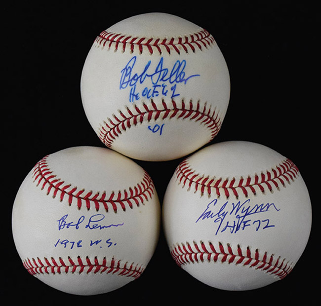 Description:Lot of (2) Bob Feller, (2) Bob Lemon, and (2) Early Wynn signed baseballs (EX-NM). Incl. (2) G.Budig AL balls signed by Bob Feller with "HOF 62" inscription added to both (EX-NM); B.Brown AL ball (light toning) signed by Bob Lemon; G.Budig AL ball signed by Bob Lemon with "1978 WS" inscription; G.Budig AL ball (light toning) signed by Early Wynn with "Cy 59" inscription; and G.Budig AL ball signed by Early Wynn with "HOF 72" inscription. Signatures rate 8/9 to 9/10 out of 10: EX-NM