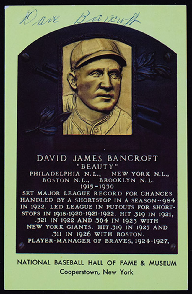 Description:Dave Bancroft signed yellow Hall of Fame postcard (EX/MT) Yellow plaque postcard by Curteichcolor has been signed on the front "Dave Bancroft" in ink rating 7 out of 10. Card has a hint of wear. Generally accepted as one of the more difficult signed cards from this popular series to locate: EX/MT ($1,000-$2,000)