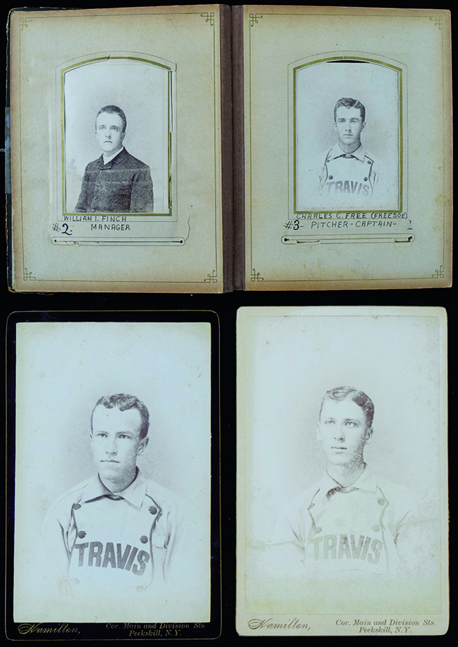 Description:Early c.1870s-80s baseball player cabinet photographs in period album - team of (14) players (13 in bib front uniforms) plus Manager and (3) "fans" (Cabinets avg. EX-EX/MT) Nice grouping consists of (14) players (all but one in bib front uniform), a young man noted as Manager, and (3) "fans." Each is identified on the album page into which his respective card is housed in period fountain pen. Cards all measure 4.25"x6.5" and those which have been removed to be inspected (small portion, all of which came out without damage done to card) are on mounts which are marked, "Hamilton....Peekskill, N.Y." Images themselves have some fading along with a touch of silvering/spotting while the mounts examined have light typical age wear. Album itself has general wear to exterior with the front cover separated and spine largely missing. Interior pages have toned and there are scattered tears: Cabinets avg. EX-EX/MT ($2,000-$4,000)
