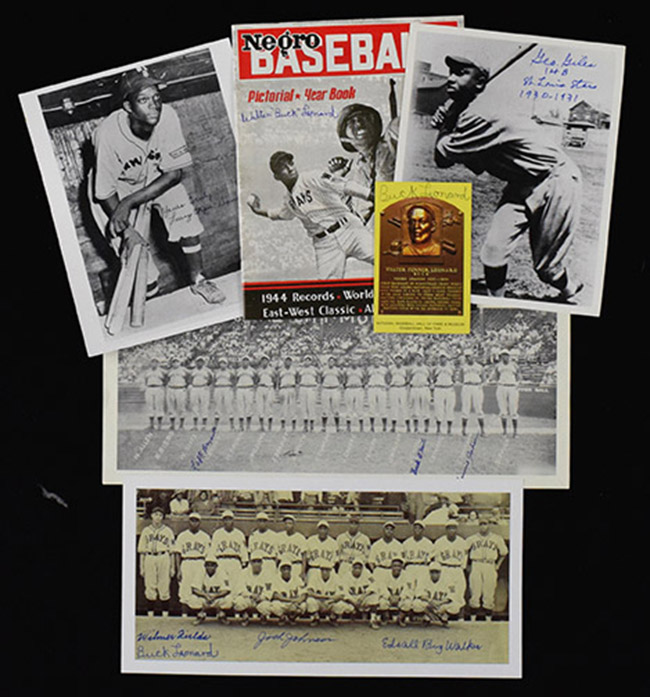 Description:Negro Leaguers autograph lot including Buck Leonard (NM-NM/MT). Incl. 1944-45 Negro Baseball Pictorial Yearbook signed by Walter "Buck" Leonard (yearbook is a modern reproduction); HOF plaque postcard signed by Buck Leonard; 8"x10" photo signed by Piper Davis; 8"x10" photo signed by George Giles with "1st B" "St. Louis Stars 1930-1931" inscription; 7"x14.5" Homestead Grays team photo signed by (4) including Buck Leonard, Wilmer Fields, Josh Johnson, and Edsall Big Walker; and 7"x17" Kansas City Monarchs team photo multi-signed by Buck O'Neil, Lefty Bryant, and Connie Johnson. Signatures rate 8 to 10 out of 10: NM-NM/MT