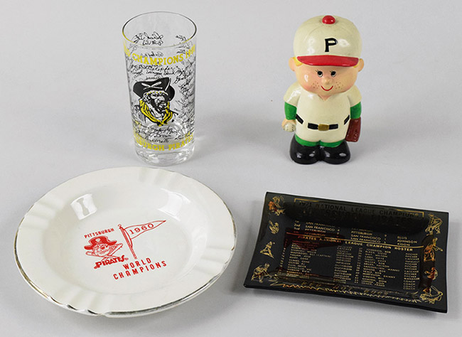 Description:Lot of vintage Pittsburgh Pirates memorabilia, c.1950s-1971 (EX/MT-NM). Incl. c.1950s-60s 6" tall bank; 8" Pirates 1960 World Champions ashtray (EX/MT); 5.5" tall Pirates 1960 World Champions glass; 5"x7" Pirates 1971 NL Champions plate; Pirates 1971 NL Pennant Winners cup; and Pirates 1971 World Champions cup (EX/MT). Range: EX/MT-NM