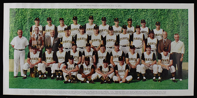 Description:1960 Pittsburgh Pirates large format team photograph premium (NM). Approx. 15"x31" team photo most likely issued as a premium. Each player is identified along the bottom border. "The 1960 Pittsburgh Pirates at Forbes Field, (July 15, 1960)" is noted along the top border. Just a hint of very minor age toning: NM