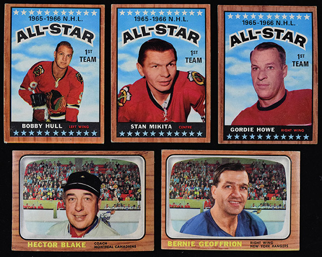 Description:Lot of (57) 1966-67 Topps Hockey cards including many HOFers (GD-NM). Includes #s 1 Blake (EX), 3, 6, 7, 8 Henri Richard (VG), 9, 10, 16, 18, 20, 23 Ed Giacomin (GD stained), 26 Rod Gilbert (VG/EX), 27, 29 Jean Ratelle (VG/EX-EX), 30, 32, 34, 40, 43, 44, 45, 46, 50, 53, 67, 70, 71, 74, 78 Dave Keon (G/VG stained), 79 Red Kelly (EX), 82, 83, 84, 85 Boom Boom Geoffrion (VG/EX), 93, 95, 100, 101, 104, 105, 106, 108, 111, 115, 116, 117, 118, 119, 121 Gordie Howe (VG/EX), 123, 124 Stan Mikita (VG/EX-EX), 125 Bobby Hull (VG/EX), 126 Glenn Hall (VG/EX), 127 Jean Beliveau (GD), 128, 129, and 131 Frank Mahovlich (VG). Various cinditions throughout the lot. Most appear to average VG/EX-EX overall, but many have better eye appeal. Range: GD-NM