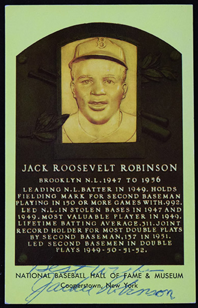 Description:Jackie Robinson signed yellow Hall of Fame postcard (EX/MT) Yellow plaque postcard by Curteichcolor has been signed at lower front "Best Wishes, Jackie Robinson" in ink rating 7 out of 10 (it appears that Robinson went over the last 2 letters after his pen skipped). Card has a hint of wear. One of the more popular signed cards from this set: EX/MT ($1,000-$1,500)
