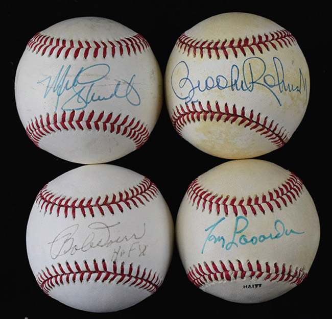 Description:Lot of (6) HOFers signed baseballs (EX-NM/MT). Incl. Official Southern League ball (surface wear) signed by Mike Schmidt; B.Selig ML ball signed by Bob Doerr; G.Budig AL ball (toning) signed by Brooks Robinson; L.MacPhail AL ball (toning) signed by Carl Yastrzemski; B.Brown AL ball (toning) signed by Cal Ripken Jr; and Dodgers logo ball (light toning) signed by Tom Lasorda. Signatures rate 7 (Doerr) to 10 (avg 8/9) out of 10: EX-NM/MT