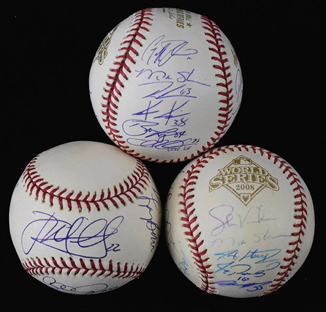 Description:2004 and (2) 2008 Philadelphia Phillies partial team signed baseballs, plus (2) commemorative balls (EX/MT-MT). Incl. 2004 Citizens Bank Park inaugural season ball signed by (10): Larry Bowa, John Vukovich, Bobby Abreu, Randy Wolf, Ryan Madson, Jason Michaels, Todd Pratt, Brian Powell, and others; 2008 World Series ball (toning) signed by (19): Carlos Ruiz, Shane Victorino, Pedro Feliz, Kyle Kendrick, Geoff Jenkins, Matt Stairs, J.C. Romero, Joe Blanton, Chris Coste, and others; and 2008 World Series ball signed by (16): Charlie Manuel, Brad Lidge, Shane Victorino, Pedro Feliz, Geoff Jenkins, Matt Stairs, Ryan Madson, Kyle Kendrick, Greg Dobbs, Joe Blanton, Clay Condrey, and others. Signatures rate 5/6 to 9/10 (avg 8) out of 10, with the toned 2008 ball having the weaker signatures. Also includes (2) 2008 Phillies commemorative baseballs: EX/MT-MT