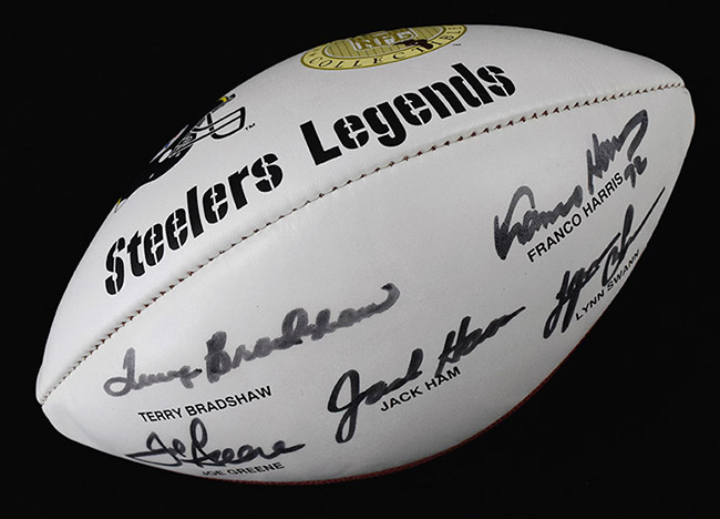 Description:"Steelers Legends" signed football with (5) Hall of Famers (EX/MT-NM) Wilson brand P.Tagliabue white panel football has printed on "Steelers Legends" logo. The panel below has been signed in marker (8-8/9 out of 10) by Terry Bradshaw, Franco Harris, Joe Greene, Jack Ham, and Lynn Swann: EX/MT-NM ($300-$500)