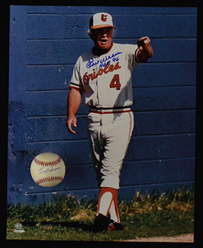 Description:Earl Weaver signed baseball plus signed & inscribed 16"x20" photo (EX/MT-NM/MT). Incl. B.Brown AL ball (light toning) signed by Weaver in blue ink (JSA); and 16"x20" photo signed by Weaver in blue marker with "HOF 96" inscription. Signatures rate 9 to 10 out of 10: EX/MT-NM/MT