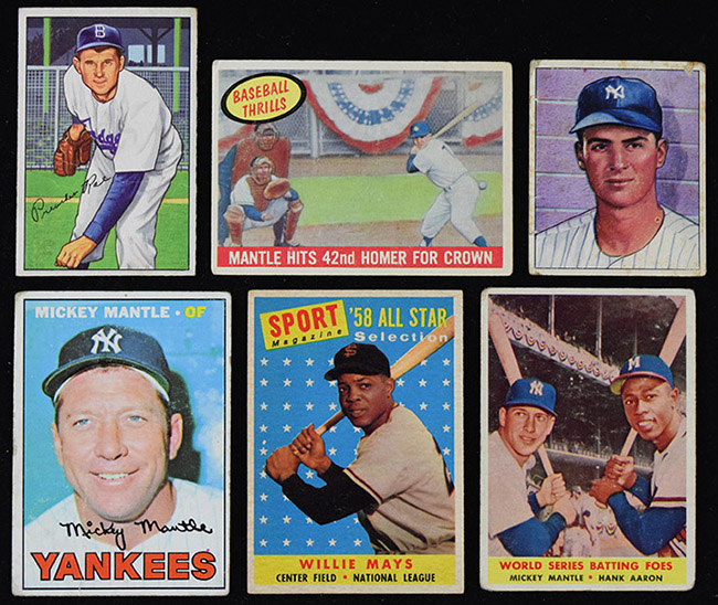 Lot of (53) Baseball cards from 1950-1967 including Mantle and Mays (PR-EX/MT). Incl. 1950 Bowman #s 41, 47, 68, 106, 128, 143, 144, 145, 154, 162, 169, 180, 191, 194, 197, 198, 208, 209, 212, 214, 216, 224, 241, 249, 250, and 252 (PR-VG, avg G/VG); 1952 Bowman #s 77, 78, 79, 95, 157, and 168 (GD-VG); 1954 Red Man #AL12 Rosen with tab (PR/FR); 1958 Topps #s 265, 409, 418 Mickey Mantle / Hank Aaron (G/VG), and 486 Willie Mays (EX); 1959 Topps #s 55, 69, 88, 90, 131, 237, 356, 357, 358 EX/MT), 372, 386, 412, 432, 452, 461 Mantle (VG); and 1967 Topps #150 Mantle (GD-G/VG). Range: PR-EX/MT
