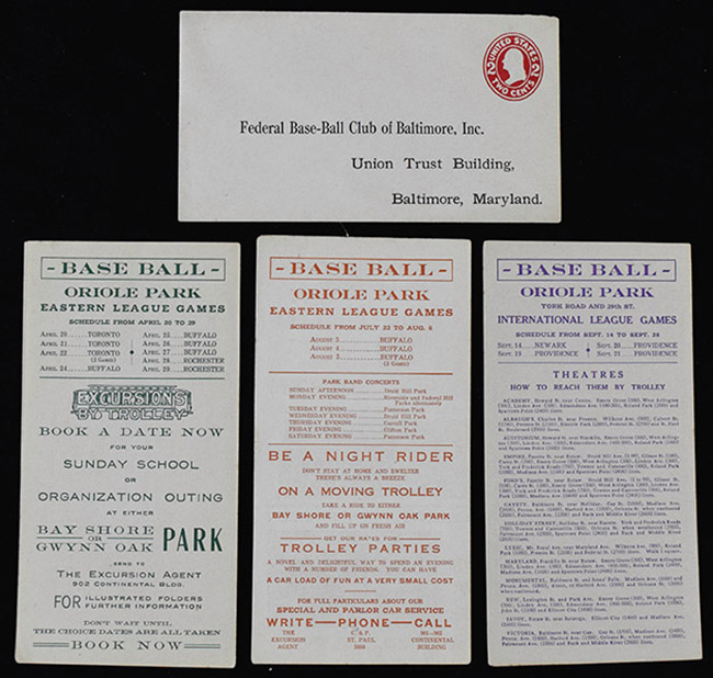 Description:Lot of vintage Baltimore baseball items from 1911-1915 including Federal League envelope (EX-EX/MT). Incl. (4) Baltimore "Trolly News" pamphlets (3 from 1911 and 1 from 1912) each with Baltimore Orioles home game schedules from various parts of the season (EX-EX/MT); and c.1914-15 "Federal Base-Ball Club of Baltimore" (Baltimore Terrapins) unused mailing envelope (EX/MT).