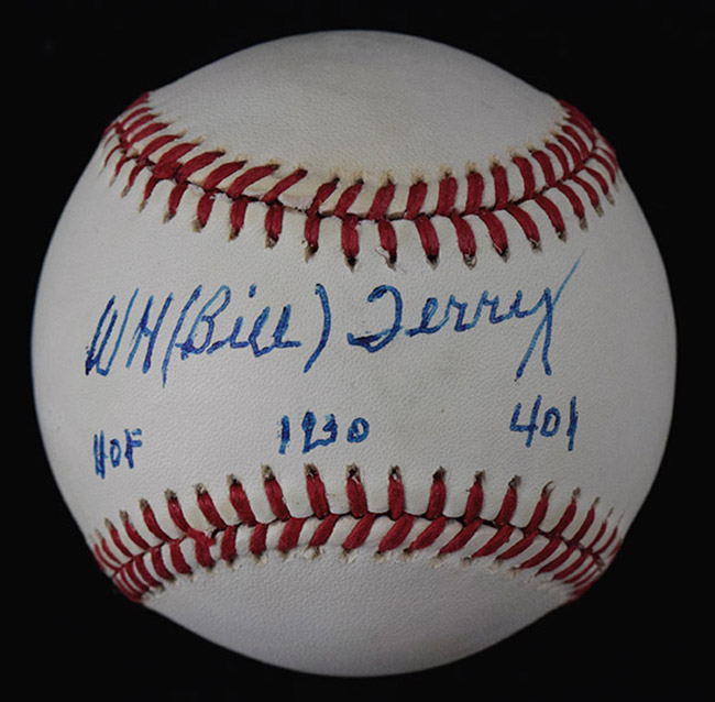 Description:Bill Terry signed and inscribed B.Giamatti NL baseball (EX/MT). Terry signed the sweet spot in blue ink and added "HOF" "1930 .401" inscriptions. Signature rates 8/9 out of 10. Mostly minor toning: EX/MT