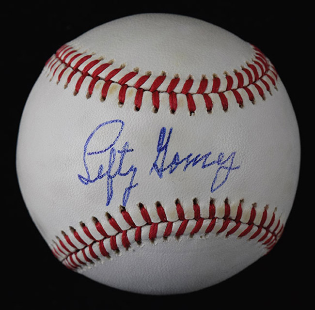 Lefty Gomez signed B.Brown AL baseball (EX/MT). Gomez signed the sweet spot in blue ink. Signature rates 8 out of 10. Mostly minor toning: EX/MT