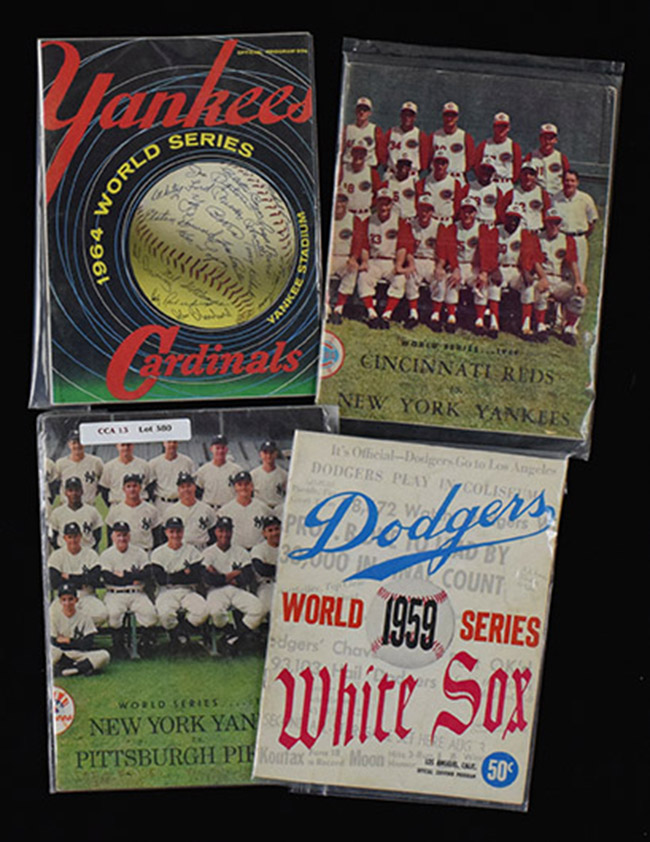 Description:Lot of (20) World Series and All-Star Game programs from 1959-1990 (VG-NM/MT). Incl. 1959 World Series (Los Angeles Dodgers version), 1960 World Series (New York Yankees version), 1961 World Series (Cincinnati Reds version), 1964 World Series (Yankees version), 1976 NLCS (Philadelphia Phillies version), 1976 World Series, 1977 All-Star Game, 1977 World Series, 1978 World Series, 1980 All-Star Game, 1980 World Series, 1981 World Series (VG nearly detached cover), (2) 1982 World Series, 1983 All-Star Game, 1985 All-Star Game, 1985 World Series, 1987 World Series, 1988 World Series, and 1990 World Series. Most appear to average EX/MT overall. Range: VG-NM/MT