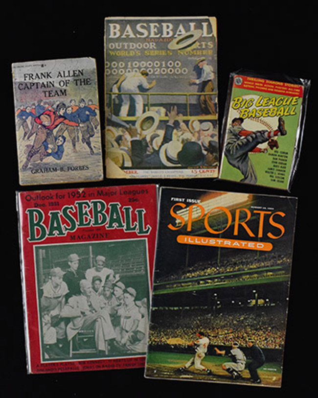 Description:Lot of (16) sports books and publications from 1912-1967 including Sports Illustrated 1st issue (GD-EX/MT). Incl. Nov 1912 Baseball Magazine (GD); 1924 Warner's Baseball Record And Rule Book; 1926 "Frank Allen - Captain Of The Team" by Graham Forbes (VG); 1929 Stall & Dean "Official Football And Soccer Rules"; 1929-30 D&M Rules book; 1930-31 Spalding's Basketball Guide (VG); 1945 "Connie Mack" hardcover book by Frederick Lieb; 1946 "They Played The Game" hardcover book by Harry Grayson (VG); 1948 "Major League Baseball" with Ted Williams cover; 1948 Rawlings "50 Golden Years Of Sports" hardcover book; 1951 "Big League Baseball"; Dec 1951 Baseball Magazine with Cy Young cover; Aug 16th 1954 Sports Illustrated first issue with uncut Topps Baseball cards sheets still attached inside (EX/MT); Sept 1956 Baseball Digest with Yogi Berra cover; 1961 "My Life in Baseball" hardcover book by Ty Cobb; and 1967 "Jocko" hardcover book by Jocko Conlan (VG). Most appear to average EX overall. Range: GD-EX/MT
