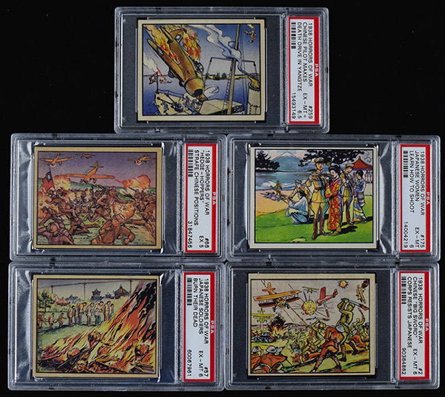 Description:Lot of (5) graded 1938 Gum "Horrors Of War" cards (EX-EX/MT+). Incl. #s 2 Chinese Big Sword Corps (PSA 6 EX/MT), 57 Japanese Soldiers (PSA 6 EX/MT), 66 Hedge-Hoppers (PSA 5 EX), 175 Japanese Women (PSA 6 EX/MT), and 259 Chinese Pilot (PSA 6.5 EX/MT+). Range: EX-EX/MT+
